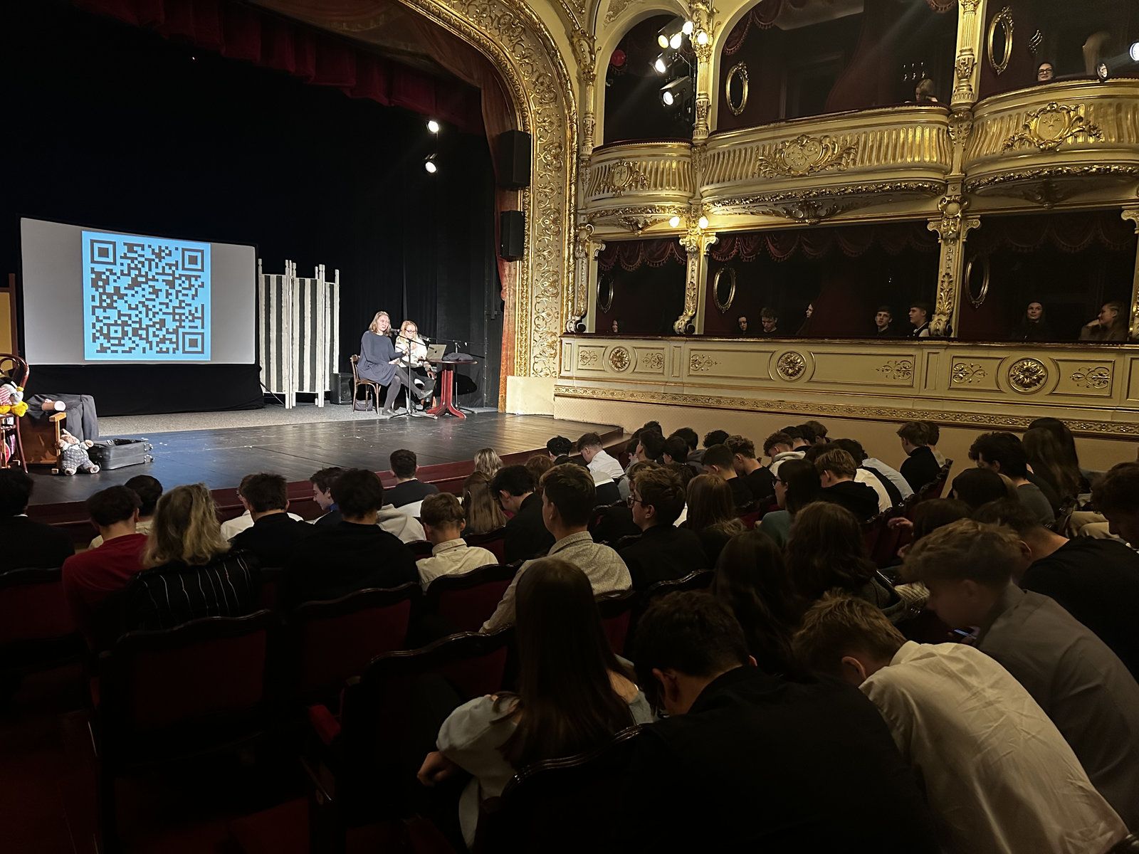 Po představení probíhala beseda s odborníky, kdy studenti mohli klást otázky anonymně ze svých telefonů díky QR kódu.