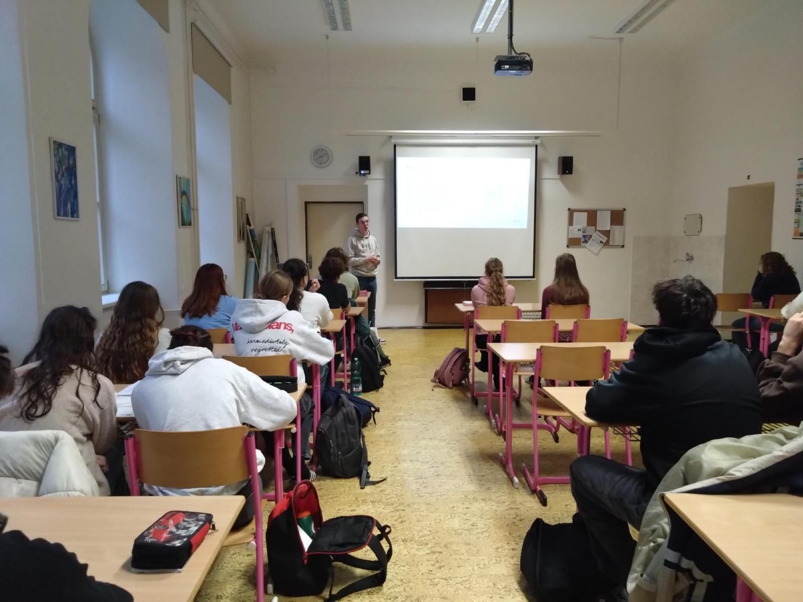 Jako každý rok zavítal mezi studenty předmaturitního ročníku gymnázia absolvent naší školy Martin Gregor, aby zájemcům představil studium na ESF MUNI.