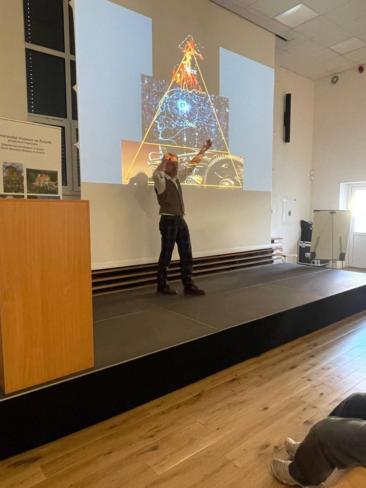 Velmi netradičním způsobem seznámil studenty se svými úvahami o životě, filozofii, ekonomii. Své vyprávění započal analýzou díla Franze Kafky, do které zapojil i posluchače. Témata besedy orientoval filozoficky i ekonomicky, vyprávění bylo proloženo množstvím grafů, do jejichž interpretace hojně zapojoval i studenty, kteří se do toho s vervou pustili.