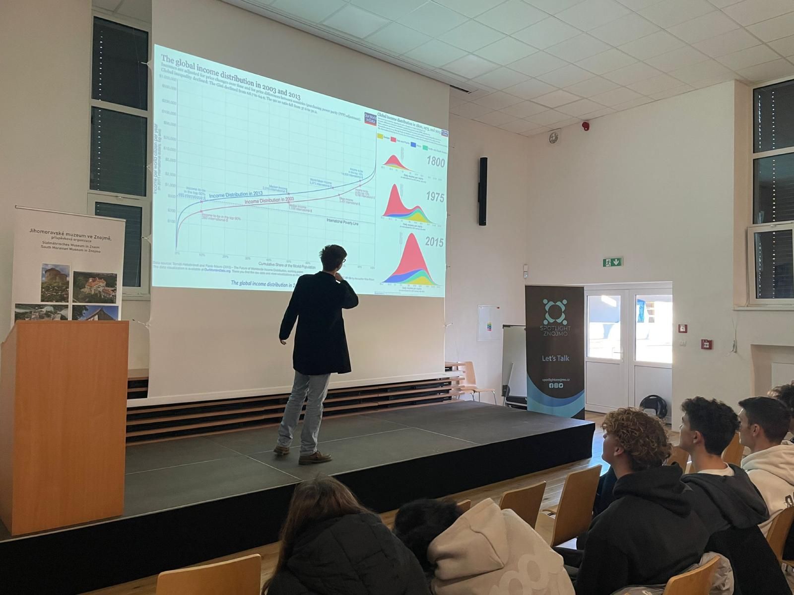 Tomáš Sedláček předal posluchačům podnětné myšlenky. Našim studentům patří velký dík a pochvala za to, jak obstojně dokázali interpretovat mnohdy složité grafy popisující ekonomickou realitu.