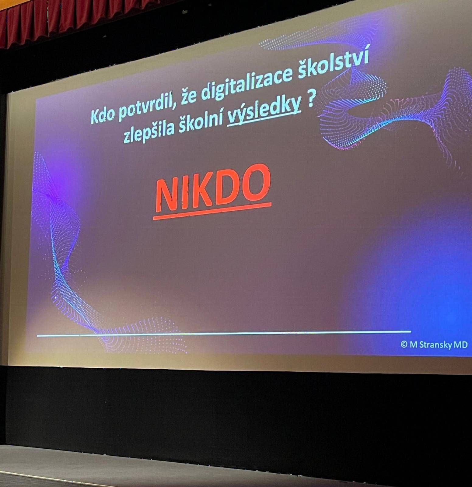 Lékař Martin Jan Stránský pohovořil se studenty o fungování lidského mozku a negativních dopadech moderních technologií na mozek i psychiku. Svá tvrzení podkládal výzkumy a pomocí grafů přibližoval lékařské závěry. Nebál se dotknout i témat, která ve společnosti silně rezonují, zazněly úvahy například o zákazu mobilních telefonů ve školách či nadužívání technologií v běžném životě. Studenti měli mnoho dotazů, díky kterým jsme ještě rozšířili okruh témat, o kterých pan doktor hovořil.