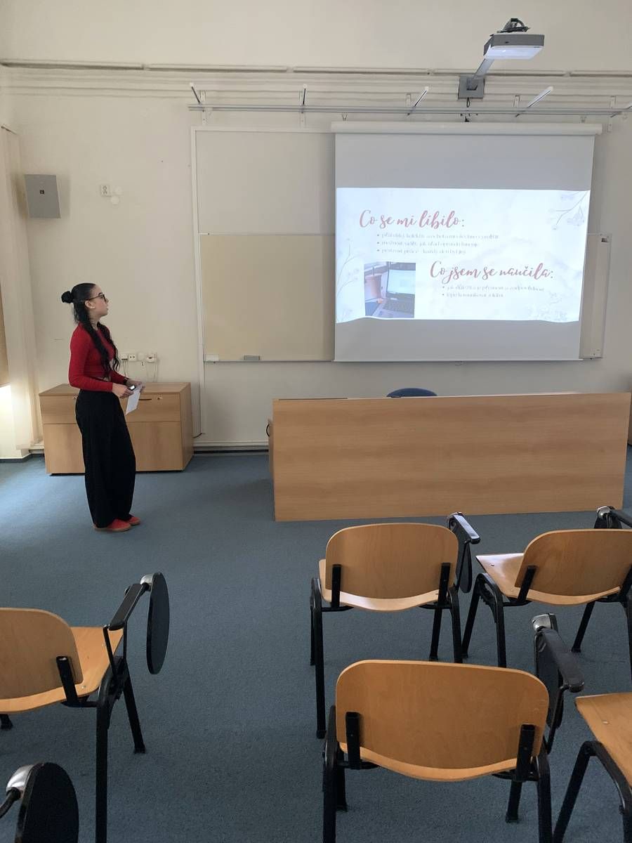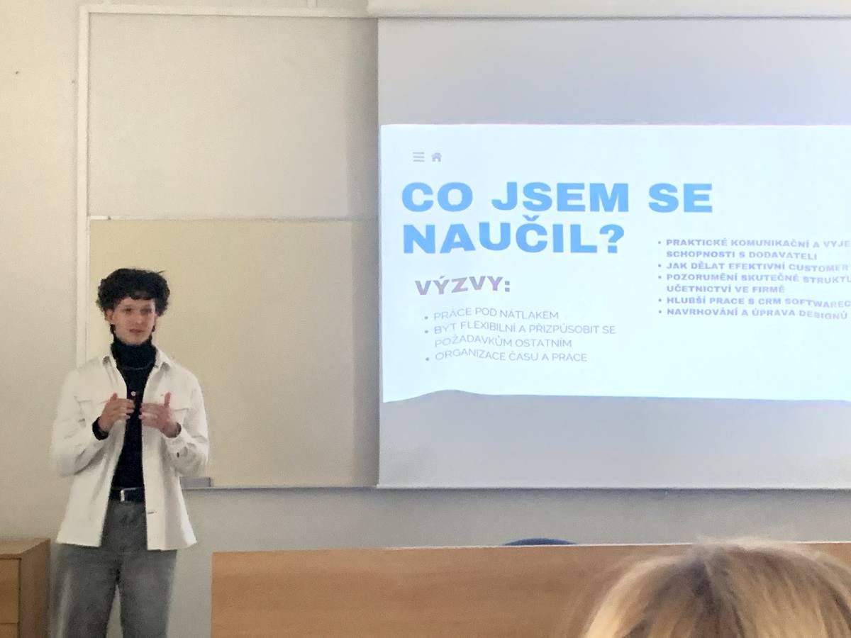 Celá třída se sešla v aule, kde nejen před svými spolužáky, ale i před zraky ostatních vyučujících prezentovali svoje poznatky, postřehy, připomínky. Obsahem výstupů z praxe byly zpracované informace z oblasti ekonomiky, účetnictví, financí a daní a personalistiky. Studenti se s námi podělili o získané praktické dovednosti, o změny, které by zlepšily chod firmy, o kolektivu, ve kterém pracovali, o náročnosti zadaných úkolů během jednotlivých pracovních dní. Další prezentace výstupů z praxe bude pro 3. ročník OA v druhé polovině měsíce května 2026.