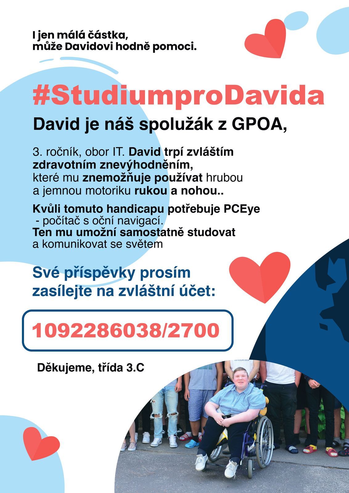 David je náš spolužák z GPOA, 3. ročník oboru IT. Trpí zdravotním znevýhodněním, které mu znemožňuje používat hrubou a jemnou motoriku rukou a nohou.