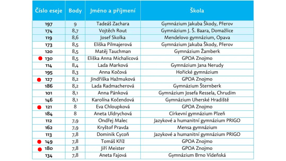 Prvního kola se zúčastnilo 10 studentů naší školy. V rámci tříd bylo nejvíce účastníků z 8.A, Eva Chloupková, Jindřiška Hažmuková, Eliška Anna Michalicová, Jiří Meister a Alžběta Vršková zabojovali se svými filozofickými úvahami. V rámci maturitních tříd se svou prací bojovaly také studentky pedagogických oborů, Eva Krouchalová ze 4.A a Jana Mrkosová ze 4.C. Autory filozofických prací byli i studenti z řad předmaturitních ročníků, Jakub Kroutil ze 7.B a Tomáš Kříž ze 3.B v rámci gymnaziálních tříd, z pedagogických pak Elena Gregorová ze 3.B. Z celkem 131 účastníků z celé České republiky je mezi 20 postupujícími 5 našich studentů. Vzhledem k počtu postupujících je to pro naši školu historický úspěch. Druhé kolo proběhne v sobotu 5. března. Úkolem postupujících je opět sepsat filozofický text, tentokrát ale v cizím jazyce. Dva nejlepší postupují na Mezinárodní filozofickou olympiádu, která se uskuteční v květnu v Lisabonu.
