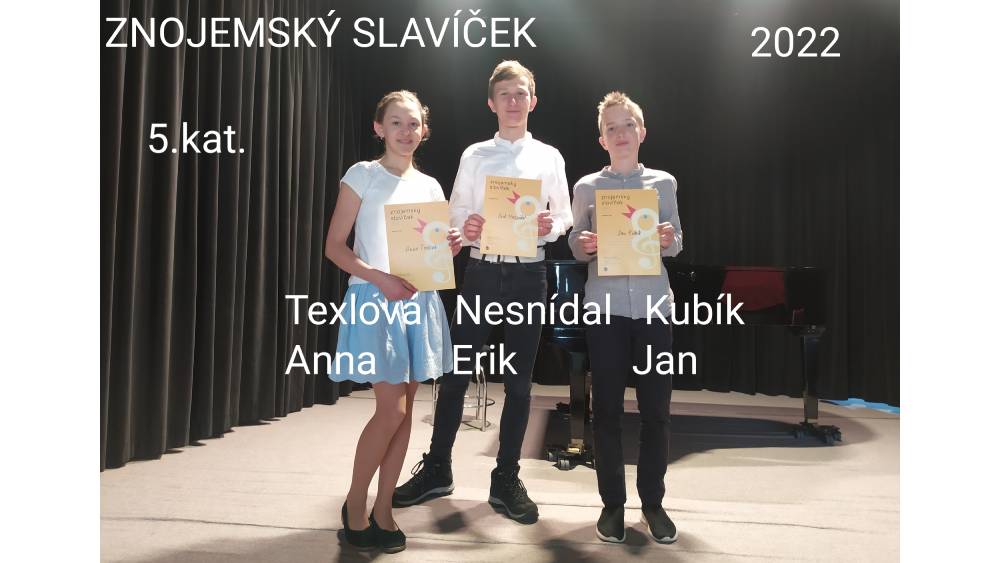 Po dvouleté pauze se letos opět uskutečnila pěvecká soutěž lidových písní Znojemský slavíček. Regionálního kola soutěže se z naší školy ve dnech 6. a 7. 4. 2022 zúčastnilo celkem devět zpěváků a zpěvaček, kteří byli dle věku zařazeni do třech různých kategorií:
