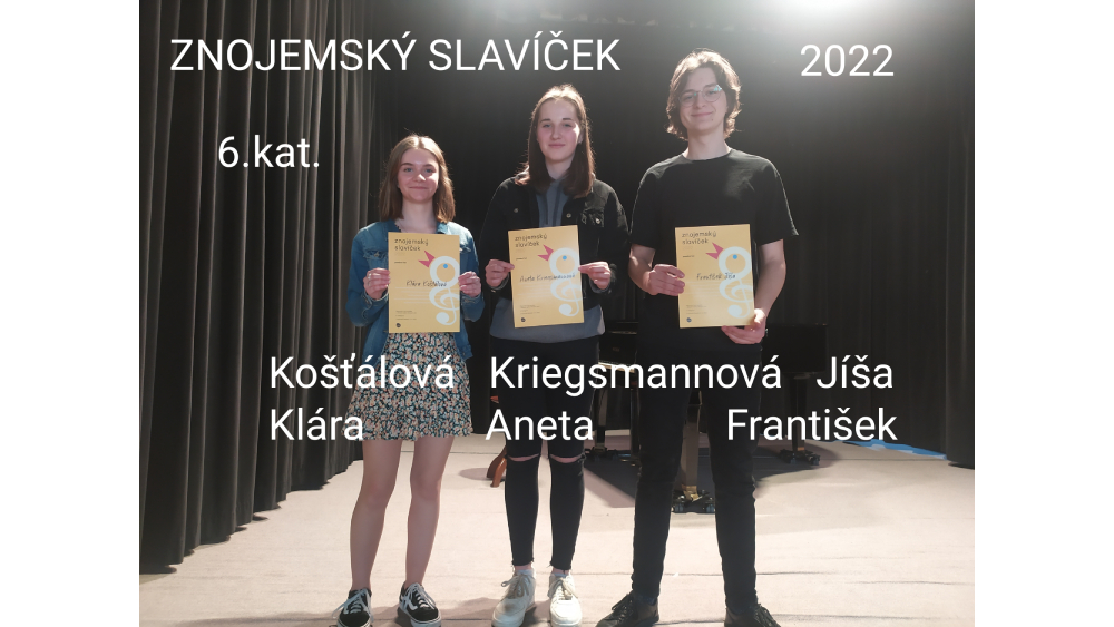Oba soutěžní dny se nesly ve velmi příjemné atmosféře plné krásných lidových písní. Studenti byli připraveni a dobře naladěni, usměvavá a příjemná porota podpořila všechny soutěžící a publikum dodalo potleskem patřičnou atmosféru a povzbuzení. Do finále pěvecké soutěže se ve velké konkurenci svým výkonem probojovali Kubík Jan, Nesnídal Erik, Texlová Anna a Jíša František. Srdečně zveme všechny příznivce lidové písničky na finále soutěže Znojemský slavíček do Městského divadla ve Znojmě, které proběhne v neděli 22. 5. 2022 od 16.00, kde finalisté zazpívají za doprovodu cimbálové muziky Antonína Stehlíka.
