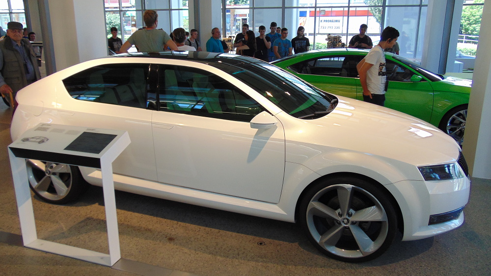 Ve čtvrtek 7. 6. 2018 se ve spolupráci se středoškolským klubem uskutečnil tematický výjezd do firmy ŠKODA AUTO a.s. v Mladé Boleslavi. Smyslem bylo nahlédnout do konkrétní firmy, kde se užívají ICT technologie ve velkém. Už po cestě nás překvapilo, kolik vozidel obsahují odstavené vlaky s novými auty od Kolína až po Mladou Boleslav. Ohromila nás velikost areálu firmy a množství kamionů s materiály pro výrobu tak běžné věci, jako je osobní automobil. Na recepci muzea nás vybavili ochrannými brýlemi, výstražnou vestou a přijímačem se sluchátky. Nejprve jsme absolvovali komentovanou prohlídku areálu firmy s návštěvou robotické svařovny a robotické i manuální montáže, pak jsme se vydali na komentovanou prohlídku muzea. V areálu firmy je bohužel přísný zákaz focení, takže jsme fotili pouze v prostorách muzea. Informací bylo tolik, že na bližší prohlídku depozitáře nám nezbývalo moc sil a radši jsme využili služeb blízkého KFC.