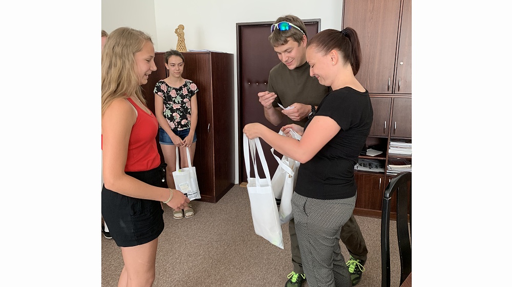 Koordinátorka projektu Zdravé Znojmo Soňa Bystřická z města Znojma a Manažer pro celospolečenské funkce lesa Ondřej Benešovský z Městských lesů Znojmo předali drobné dárky, včetně volné vstupenky na znojemské vinobraní, děvčatům z gymnaziálních a pedagogických tříd GPOA Znojmo.