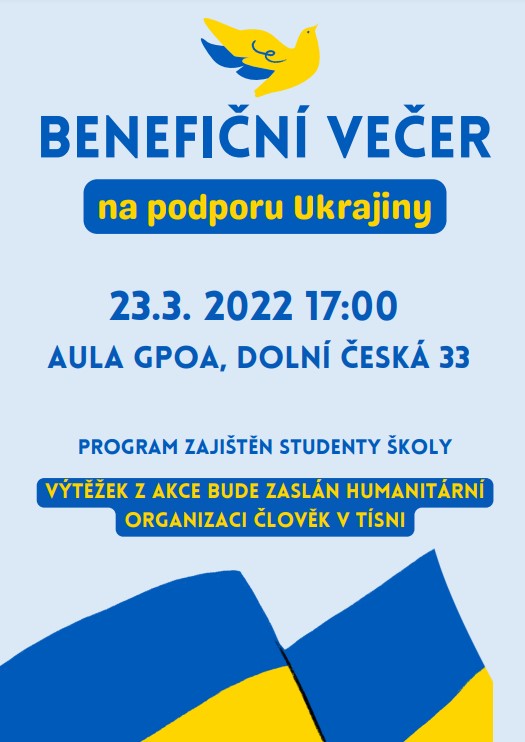 Tématem večera bude konflikt na Ukrajině, který nám není lhostejný, a chceme svou troškou pomoci. Veškerý výtěžek z akce poputuje na účet humanitární organizace Člověk v tísni. Je zajištěn bohatý kulturní program. Můžete se těšit na vystoupení školního sboru Znoimia, uskupení SpokoTrio, dramatické představení, ale i krátký vhled do historie Ukrajiny, který nám zprostředkují pánové historici Kacetl a Sturz, a mnoho dalšího! Na akci bude též možné zakoupení náramků vyrobených paní Řihákovou a také koláčů, které napečou žáci G2.A. Pevně doufáme, že se ve středu sejdeme v co nejhojnějším počtu a budeme tak schopní pomoci Ukrajině co nejefektivněji dokážeme!