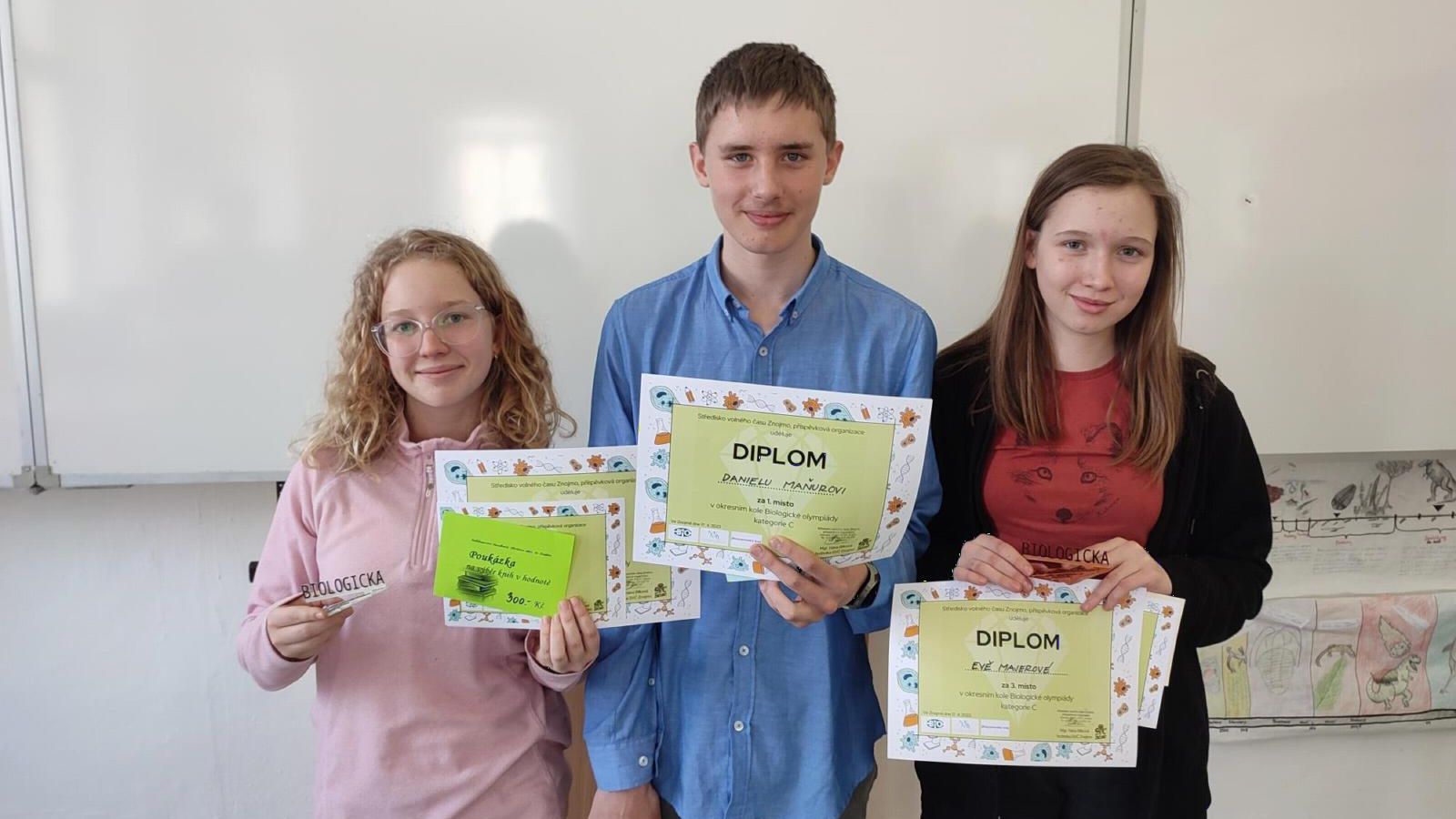V kategorii D, to jsou naši nejmladší biologové, kteří se učí učit a hodně velkou výzvou je poznávačka rostlin a živočichů tzn. poznat a pojmenovat organismus a to je hodně náročný úkol. Další dovedností je schopnost napsat práci, která souvisí s pozorováním živých objektů a přesnými pravidly, jak text a obrázky seřadit. Nejlépe se umístil v okresním kole Ota Liebiger z G2.A, který získal 3. místo.